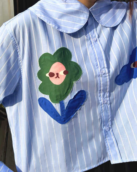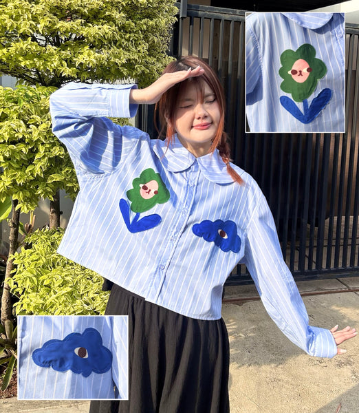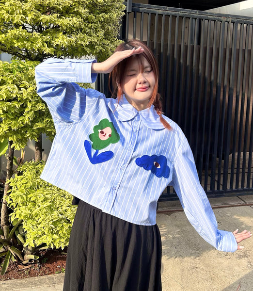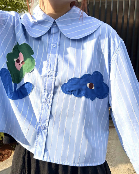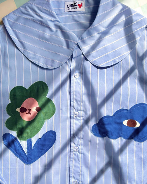 A relaxed-fit long sleeve buttoned shirt in comfy cotton blend, with stitched patches of Liunic’s signature flowers and clouds. Just the right amount of cute to get through your 9 to 5.